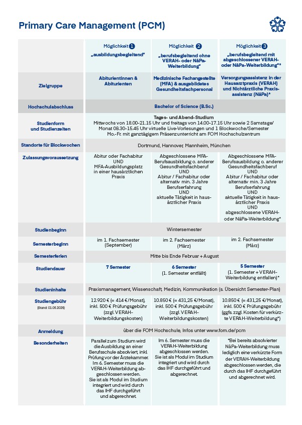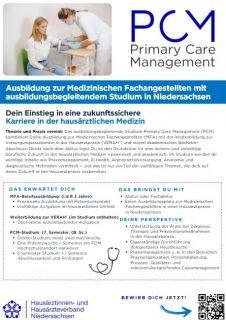 Die Anforderungen in Hausarztpraxen wachsen stetig – von Patientenmanagement über Praxisorganisation, Prozess- und Qualitätsmanagement bis hin zu digitalen Anwendungen. Um diese Herausforderungen optimal zu meistern, bietet der Hausärztinnen- und Hausärzteverband Niedersachsen in Kooperation mit der FOM Hochschule das innovative Bachelorstudium Primary Care Management (PCM) an. Dieser Studiengang verbindet die Ausbildung zur Medizinischen Fachangestellten (MFA) mit einer akademischen Qualifizierung: dem PCM-Bachelorstudium. Enthalten ist zudem die etablierte Weiterbildung zur Versorgungsassistenz in der Hausarztpraxis (VERAH®).